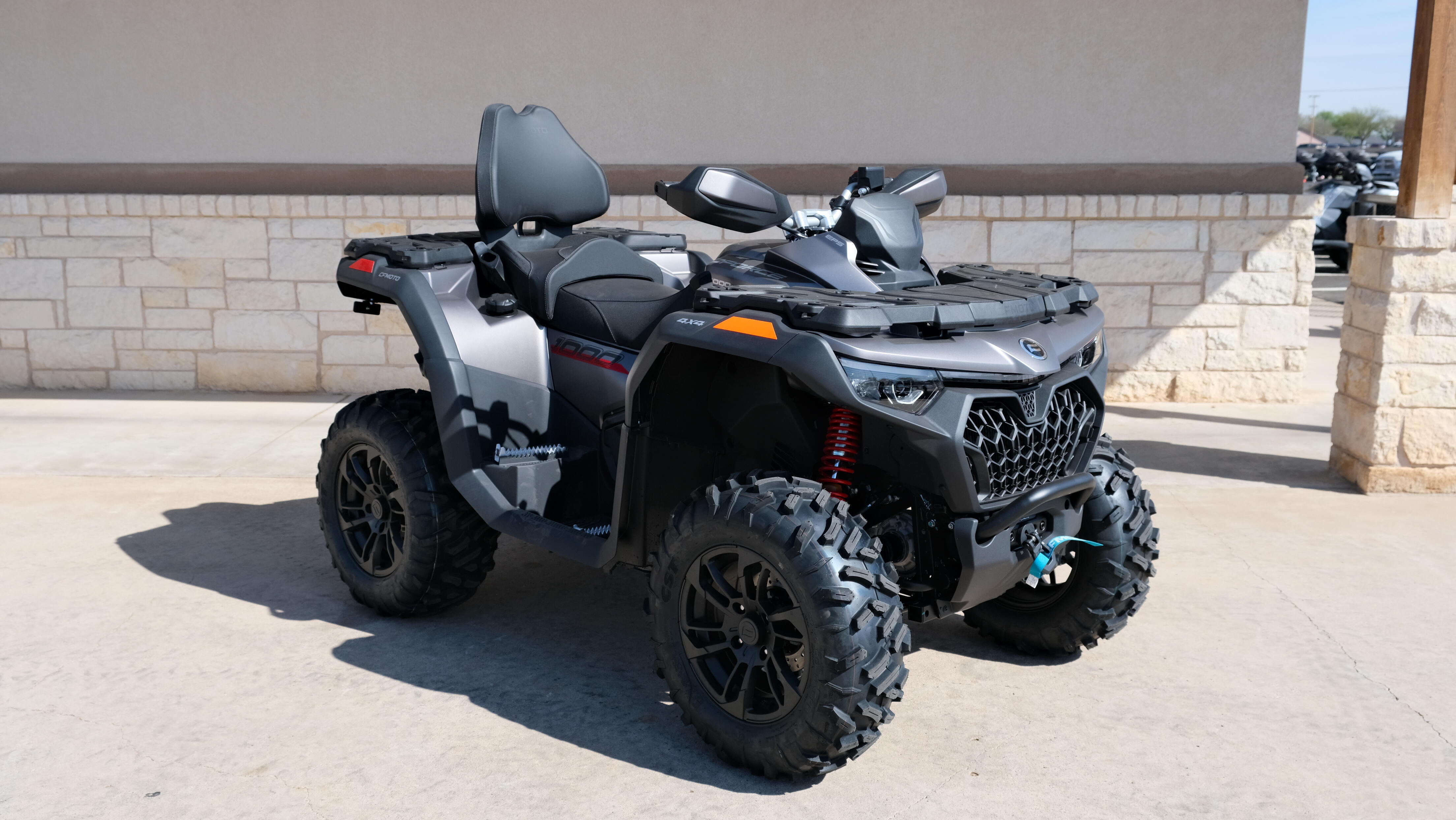 • ADDITIONAL FEATURES: Passenger seat, brushless electronic power steering, Bosch® EFI with work/normal/sport modes, 3500 lb. winch with synthetic rope, CFMOTO LED™ headlights & taillights with daytime running lights, steel racks with composite cover, 7” TFT display, Bluetooth call indicator, 2” receiver, remote reservoir gas shocks, hand guards, heavy-duty steel bumpers, fender flares, 12V outlet, USB port, Downhill Assist Control, CFMOTO RideSync app compatible (T-Box)